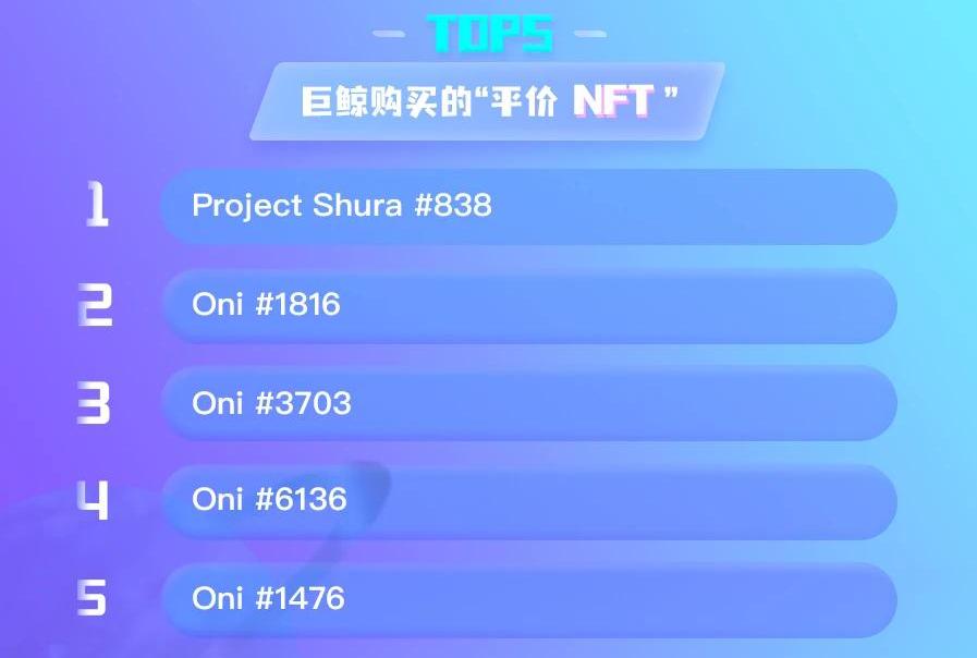 过去24小时,巨鲸购买的“平价NFT”中排前五的分别是:ProjectShura#838、Oni#1816、Oni#3703、Oni#6136和Oni#1476。