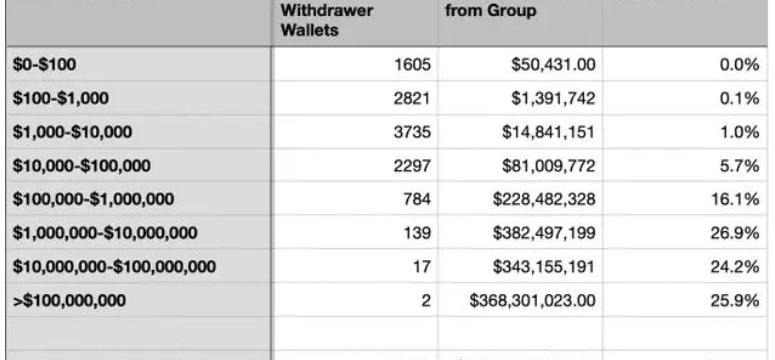 我们能得出一个结论,大规模的恐慌并没有蔓延,人们依然想把他们UST存在Anchor中。大部分用户在这次脱锚事件中并没有移动他们的资金,甚至都毫无察觉此次事件。小部分人产生了恐慌,并造成了价值100万美元以下的资金移动。而75%的资金转移量来自于恐慌人群的1%,他们占所有用户的0.1%。原地址