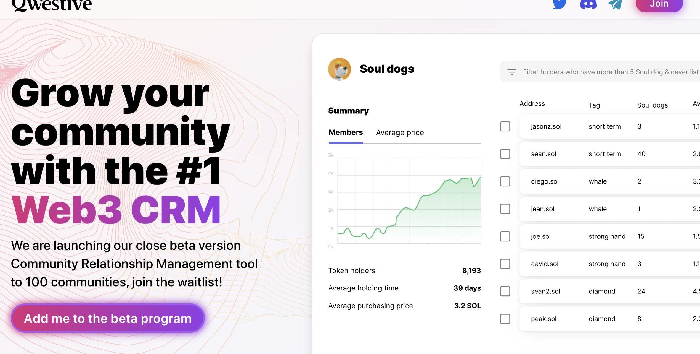 Qwestivehttps://qwestive.io/HomeQwestive是一个Web3CRM平台,通过代币持有者分析和Web3原生社区管理工具帮助代币社区保留和扩大用户群。Qwestive通过以下4个功能来实现社区管理:实时代币持有者分析,通过持有人的链上和链下数据来分析他们的行为。无代码空投,通过一键空投代币或者NFT的形式来奖励你的持有者。数据驱动的合作伙伴关系,与合适的项目合作来扩大你的影响范围。与持有人直接沟通将你的持有人分组并有针对性的发送公告和信息。