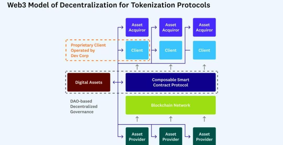 在这个模型中,NFT项目的经济去中心化可以通过几个步骤来实现:首先,DAO可以将其初始资源用于社区参与并资助社交聚会和其他活动——从而提高社区的隐性激励。其次,这些隐性激励——以及显性激励——可用于激励衍生项目的创建利用社区的知识产权。开发人员将因开发此类项目而获得奖励,而消费者将因使用它们而获得奖励。例如,DAO可以聘请第三方开发人员使用社区的角色创建一个通过游戏赚钱的游戏,游戏内的代币经济学以社区的本地数字资产为特色。在这方面,衍生项目的行为类似于早期开放去中心化模型中描述的客户,从而使整个系统减少对任何单一来源的依赖来为NFT持有者带来价值,这有助于限制出现重大信息不对称的风险。最后,NFT项目可以使用的另一个重要工具是对DAO产生的NFT二次销售的特许权使用费,这可以推动其去中心化经济。在衍生项目可能无法为系统产生足够回报的时期,这些特许权使用费将为DAO提供去中心化的收入流。最终,衍生项目和二级销售给生态系统带来的价值相结合,可以推动为NFT项目创造一个健康的去中心化经济。从法律权力去中心化的角度来看,关键问题再次是:任何第三方的基本管理努力是否是推动Web3系统成功或失败的必要条件?是否有可能出现严重的信息不对称?这两个问题的答案将取决于上面讨论的许多相同的考虑。但是,在这种情况下,NFT场景中的知识产权可能会促进而不是阻碍社区的整体去中心化。为什么?因为知识产权是从去中心化的来源贡献给DAO的。此外,如果DAO要控制代币的分配、NFT的额外铸造和去中心化的知识产权——以及去中心化的收入流——该系统不太可能产生严重的信息不对称。大多数NFT项目仍处于初期阶段,因此我们还没有看到很多NFT项目部署去中心化代币经济学的例子,但我们希望看到各种机制。同时,许多学习也可以融入其他Web3系统的NFT项目中。开放去中心化:如何将代币化协议去中心化代币化协议是另一种新兴的Web3系统。在这些系统中,资产被载入区块链,通过智能合约协议进行代币化,然后出售或用于其他目的。代币化协议的类型包括串行NFT铸造项目、数字资产市场和代币化现实世界资产的协议。下面的开放去中心化模型反映了:通过共享的智能合约协议将资产从多个供应商带到链上;将此类资产代币化的智能合约协议;通过多个客户出售或使用此类代币化资产;原生数字资产分配和激励机制;关于社区知识产权和DAO金库的DAO治理启动。