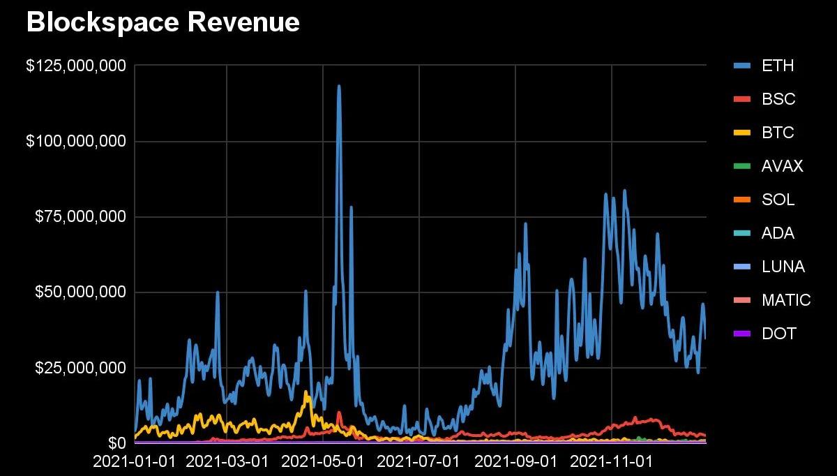 区块链增加交易收入的主要方式是增加区块效用;增加每个块内可以做的事情的价值。这可以通过在网络之上构建有价值的应用程序、增加网络上可能的表面积和用户可以获得的实用程序来实现。例如,在以太坊上,世界上任何人都可以在Uniswap上将100万美元的ETH换成100万美元的DAI。这对某人来说可能非常有价值。他们很乐意支付10美元的费用来解决该交易。事实上,也许他们愿意支付高达1,000美元。也许在压力和波动时期,他们可能愿意支付10,000美元来立即处理他们的交易。一个理性的参与者愿意为一个区块支付比他们可以从这个区块中提取的价值略高的价格。随着应用层变得更加活跃,区块变得更有价值,因为应用在区块内创造了经济机会。区块空间收入几乎与网络上有价值的应用程序的数量以及它们所拥有的机会直接相关。当我们看比特币时,这一点更加明显。比特币实际上只有一个应用——移动比特币。因此,它难以产生大量的区块空间收入,如其-98%的利润率所示。一个用例只能产生这么多的收入。借助智能合约平台,可以构建无限量的应用程序,从而使区块空间收入可以扩展超过单个应用程序特定的区块链。我们现在可以看到这种情况正在发生,因为多个智能合约平台的费用收入已经超过了比特币,包括几个以太坊应用程序。与转移比特币相比,市场愿意为在以太坊上交换代币支付更多费用。
