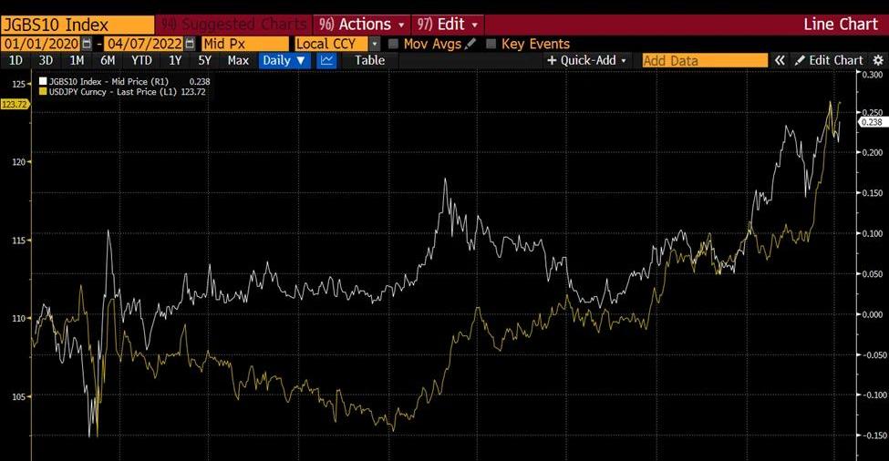 美国消费者价格指数与日本消费者价格指数的对比图通货膨胀率继续低于日本央行的目标,这使日本更有勇气继续进行收益率曲线控制。为了刺激奄奄一息的日本经济,日本央行将10年期国债的收益率限制在不超过0.25%。他们通过承诺用印刷的日元购买无限量的政府债券来实现这一目标。利率、汇率和资本账户开放这三位一体的神圣概念再次出现。日本有一个开放的资本账户和价格固定其政府债券收益率,导致日元贬值。日元贬值的原因是,市场最近对日本进行了考验,看他是否有勇气在日本国债收益率超过0.25%时无限制地买进。日本开动了日本央行的印钞机,购买了债券,收益率回到了正常水平。