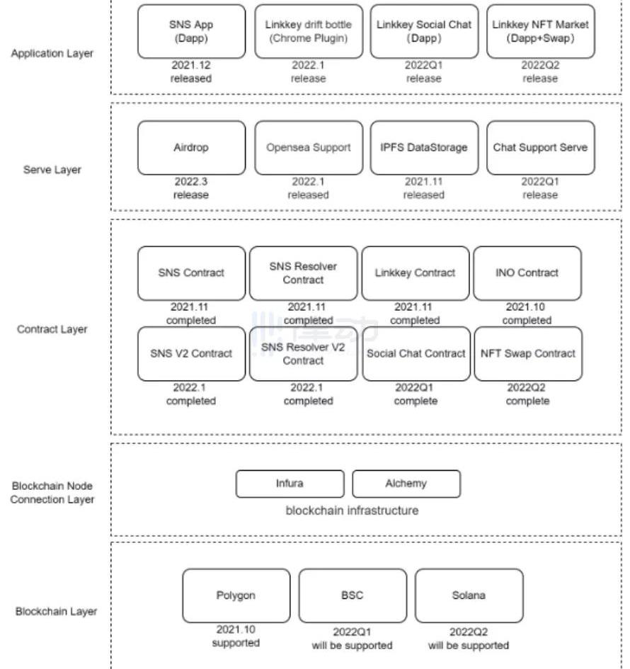 Linkkey是一个Web3开源社交协议,用户可以在这里运营自己的个人NFT和社区NFT。它基于SNS底层域名协议,这是ENS上的一个分叉,集成了了跨链、多链注册,以及NFT社交等应用场景,并且不会收取年费。同时LinkKey也是一个DAO组织,没有任何赞助方或投资者,以KEY为治理Token。Linkkey将首先部署在Polygon链上,并在未来兼容BSC、Solana等更多生态。目前,SNS域名合约仍然基于以太坊ERC-721标准构建,KEYToken则采用ERC-20标准。此外,Linkkey生态系统中的数据会使用IPFS协议进行永久存储。