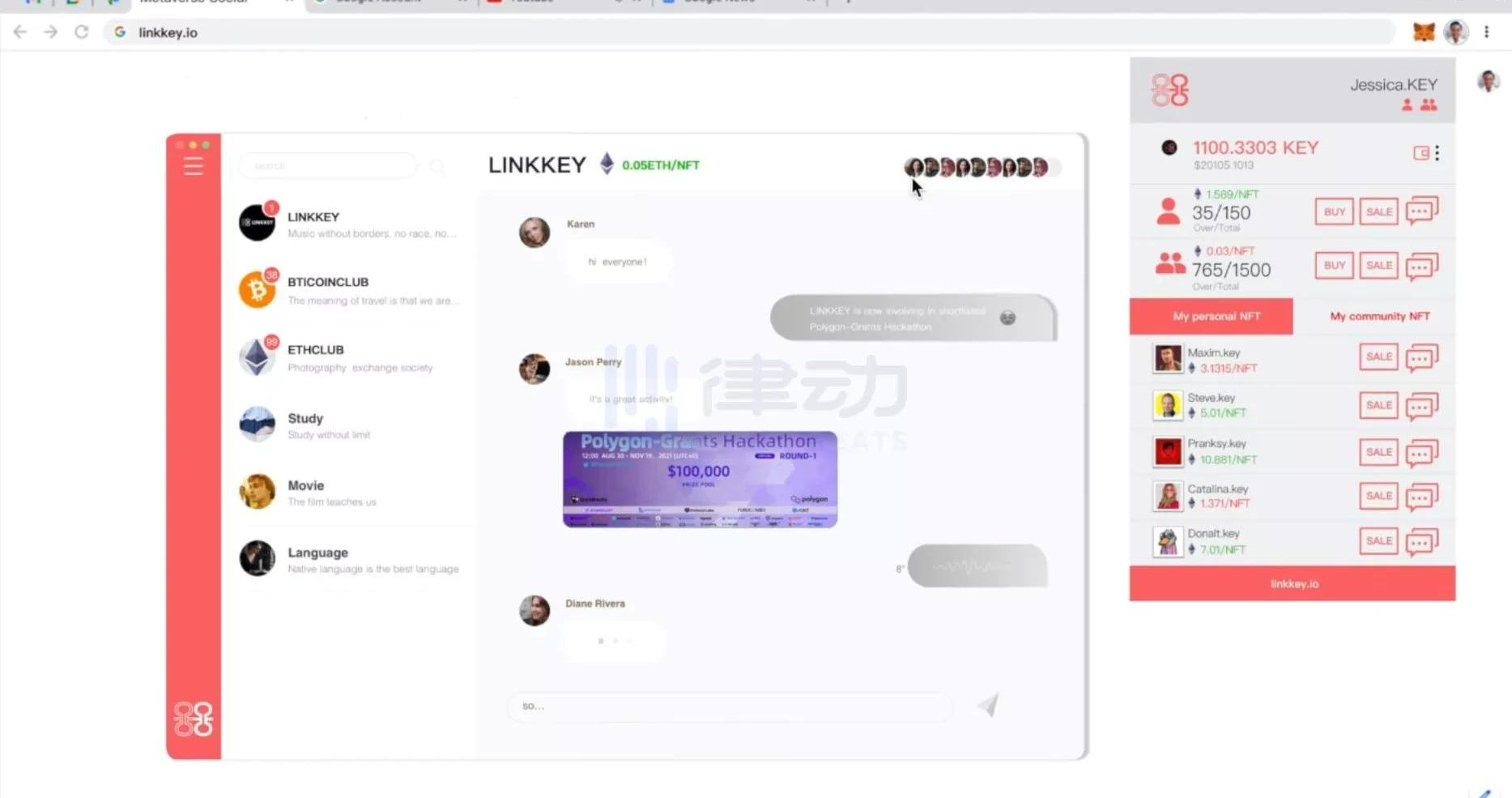 在Linkkey中,每个用户最多可以发行150个NFT,每个社区最多可以发行1500个NFT。这些NFT象征着你不同社交行为的价值。和ENS一样,越早加入的用户,就越能获得越珍贵的域名。在官方的Demo中可以看到,Linkkey将会提供浏览器插件,集成了钱包、个人NFT和社交NFT等链上信息,点击个人信息右侧的聊天按钮即可打开聊天室。通过API和插件集成,Linkkey聊天室可以在大多数dApp和网站中使用,而持有相同的个人或社区NFT的用户则会会自动组成一个安全且私密的群聊。