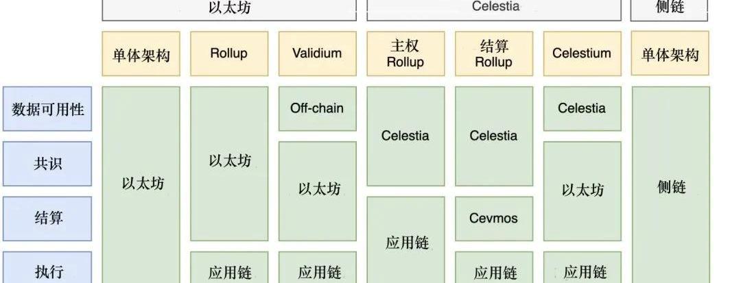 “Celo计划将一个价值30亿美元的L1区块链重组为基于Celestia之上的主权rollup,随着模块化基础设施的成熟,我预计会有更多的项目会选择这样做,因为他们会意识到数据可用性、共识、结算和执行不需要捆绑在一起。区块链的拆分才刚刚开始。”而来自ConsenSys的L2区块链工程师faina.eth则不认同RyanWatkins的说法,其评论称:“但如果它们没有捆绑在一起,那么‘rollup’就只是一个侧链,不是吗?这本身并没有错,但我们应该明确一下术语。”那么究竟哪种说法更值得认可呢?我们先通过一张图来简单了解以太坊、Celestia以及侧链的架构有哪些不同。