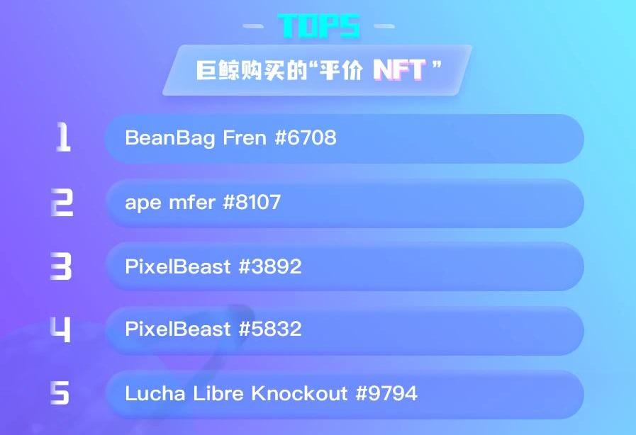 过去24小时,巨鲸购买的“平价NFT”中排前五的分别是:BeanBagFren#6708、apemfer#8107、PixelBeast#3892、PixelBeast#5832和LuchaLibreKnockout#9794。