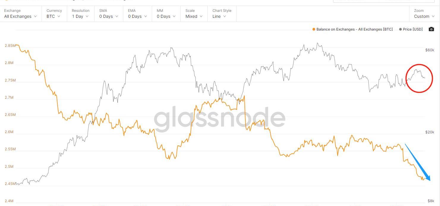 图:鲸鱼数量与BTC价格走势2)、交易所余额:大幅减少,创出阶段新低,真实可流通筹码越来越少,一方面说明大饼共识性越来越强;另一方面说明链上金融行为增加,抵押的越来越多;从历史上看,交易所余额减少,不能代表行情会直接上涨,但往往大幅减少出现之后,会再度出现一波不错的上涨行情。