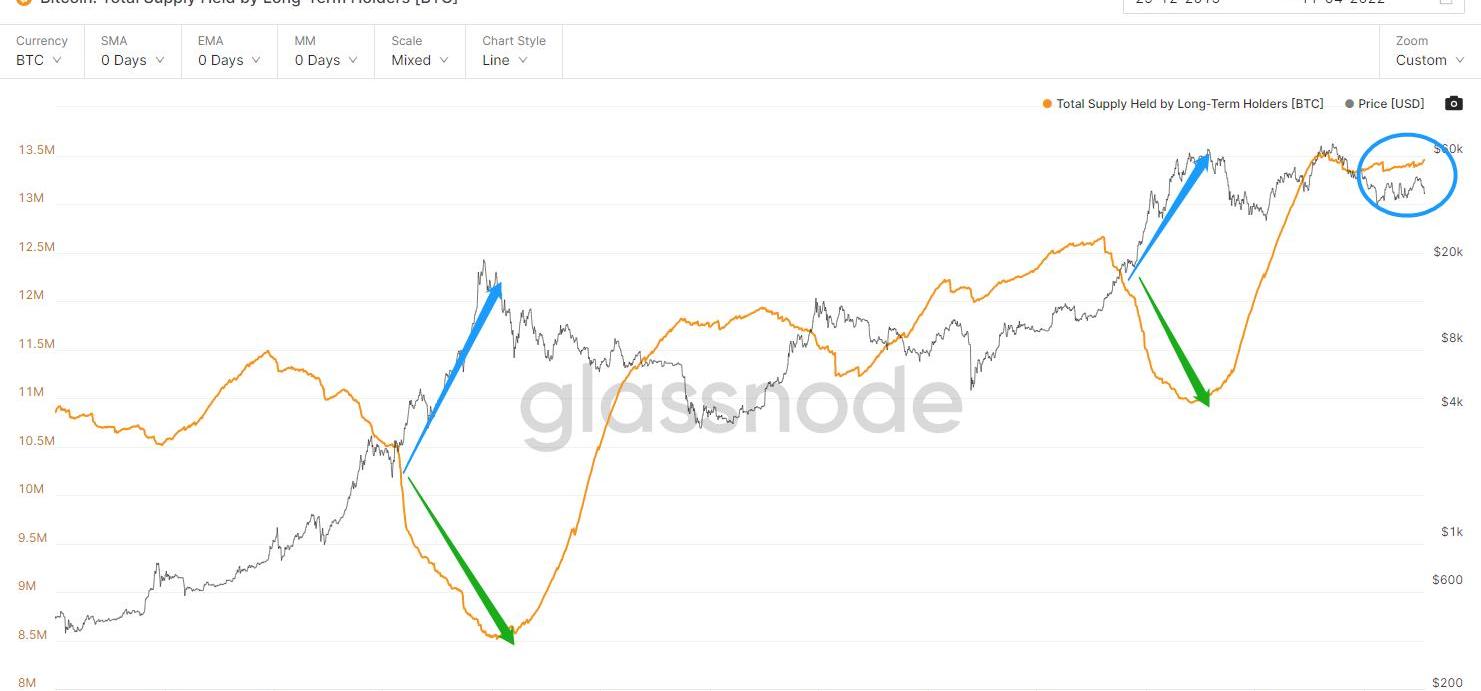 图:2016年至今非流动性供应量变化与BTC价格对比6)、长期持有者持有的流通供应总量:2017、2021年牛市上涨中,长期持有者都在上涨途中大规模变现,指标与价格呈现剪刀差走势。但BTC从29000上涨至69000并未出现之前大规模减持情况,侧面说明长期持有者认为目前的下跌是短暂行为,时间拉长BTC调整后还有向上空间。