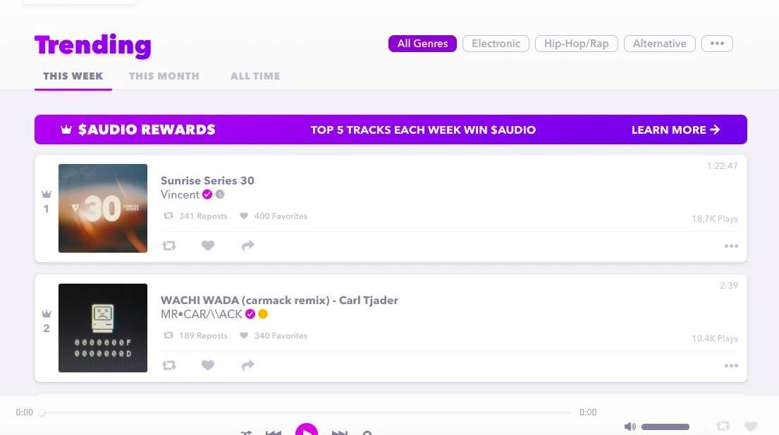 AudiusAudius是一个去中心化音乐共享和流媒体协议,采用邮箱+钱包的登录方式。该平台上的粉丝可以与艺术家直接联系,并确保艺术家可从其作品播放流中获得大部分收入。Audius平台不存在任何中间人,整个体验设计都是希望将音乐直接从艺术家传递给消费者。Audius有一个激励模式,每周热门歌曲前5的作者或者前5名热门歌单的制作者都可以获得100个token的奖励。