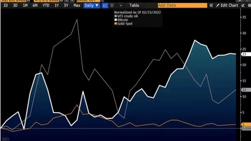 如果原油价格像1990年和2008年那样走极端,今年可能会跌向50美元。这种逆转将为比特币提供价格支撑点,因为它将减少美联储加大限制的必要性。俄乌战争后的比特币优异表现能否持久?这场战争可能是比特币价值的又一个里程碑。自俄乌战争至4月4日以来,比特币的价值已经上涨了约20%,大约是原油价格涨幅的两倍,虽然牛已经被拉来拉去好几回。图表中还值得注意的是,在这种冲突中,典型的价值存储工具——黄金的表现不佳。我们仍看好黄金,但认为其在战争期间的表现表明与数字新贵相比,传统抵押品的使用率正在减少。2.比特币相对于原油、黄金的优势