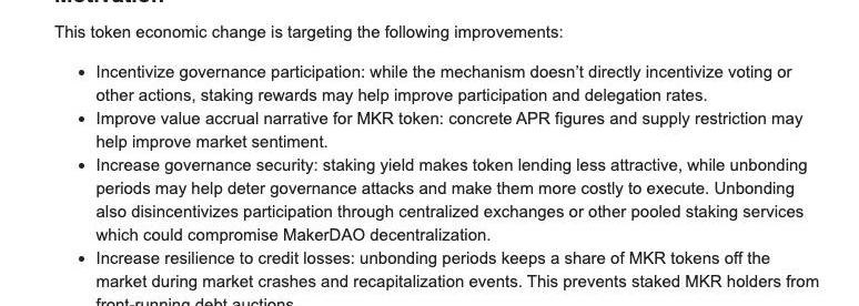 其一,可以激励治理的参与程度。虽然该机制不会直接激励用户的投票行为,但质押MKR的潜在收益有望提高社区整体的参与率。其二,改善MKR的增值叙事。相较于回购销毁模型,更具体的APR数字和流通供应缩减有助于改善市场整体情绪。monetsupply.eth也大概测算了一下收益数字,当50%MKR被质押时stkMKR的收益率约为3.25%,当20%MKR被质押时stkMKR的收益率约为5.5%。其三,提高治理安全性。质押收益客观上降低了借贷MKR的吸引力,锁定期的存在则可以有效阻止治理攻击并使它们的执行成本更高,同时也可抑制CEX以及其他可能损害MakerDAO去中心化效果的中心化服务商参与进来。其四,提高对协议信用缺失的抵抗能力。在市场崩盘或重组期间,锁定期的存在可以使部分MKR远离市场,这可以防止部分MKR持有者抢先进行债务拍卖。Compound:再见,流动性挖矿