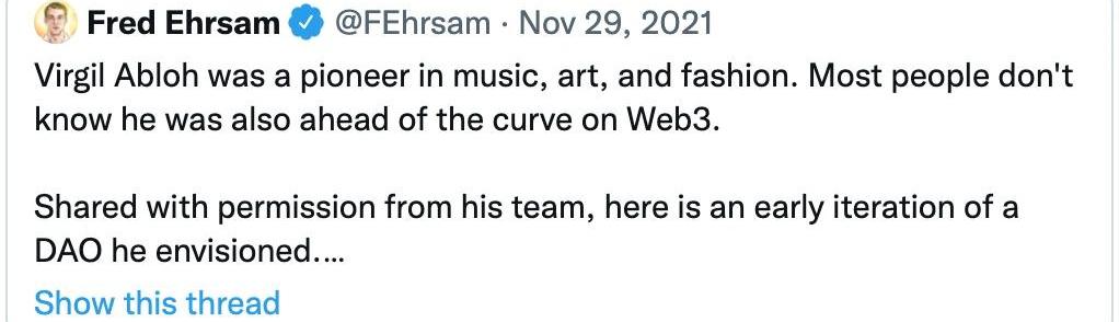 VirgilAbloh是音乐、艺术和时尚的先驱。大多数人不知道他在Web3方面也是走在了前面。经他的团队许可分享,这是一个他设想的DAO的早期迭代。可以说,到目前为止,在这一方面做得最好的团队是迪斯尼,但这很快就会改变。迪斯尼之所以能成为一个标志性的品牌,是因为他们认识到人们有一种自然的倾向,即亲身体验事物。但我们现在已经超越了迪士尼,因为我们有技术来创造去中心化的品牌和知识产权。