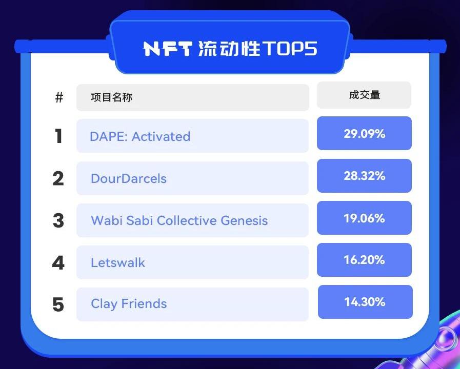 按过去24小时流动性指标,排名前五的项目分别为DAPE:Activated、DourDarcels、WabiSabiCollectiveGenesis、Letswalk和ClayFriends。