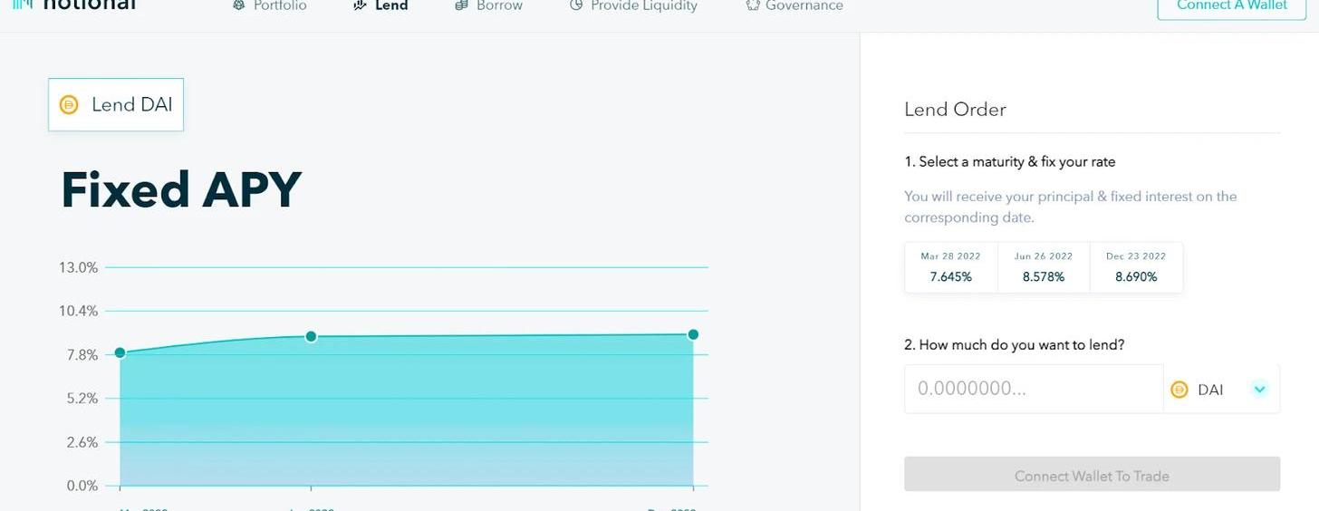NotionalFinance是一种去中心化的固定利率借贷协议。该项目由fCash代币为基础,用于在任何给定时间跟踪Notional生态系统内的负债。Notional拥有自己的流动性池,它由fCash面额和结算代币组成。因此,想借钱赚取固定收益的人可以从Notional购买fCash代币,类似于Element的本金代币的运作方式。使用fCash赚取固定收益。