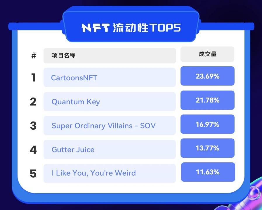 按过去24小时流动性指标,排名前五的项目分别为CartoonsNFT、QuantumKey、SuperOrdinaryVillains-SOV、GutterJuice和ILikeYou,You'reWeird。