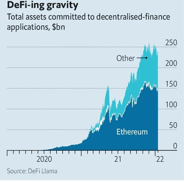 对信仰者来说,开放的公共区块链为构建数字经济提供了第二次机会。构建在这些区块链之上的应用相互协作,且它们存储的信息对所有人都是可见的,这一事实让人回想起互联网早期架构师们的理想主义,那时大多数用户还没有接受科技巨头提供的“围墙花园”。过去一年,随着构建在各种区块链上的应用在规模和功能上蓬勃发展,一种新型“去中心化的”数字经济成为可能。也许这种数字经济中最重要的部分是去中心化金融(DeFi)应用,这些DeFi应用使用户能够交易资产、获得贷款和存储存款。现在,这一领域的市场份额争夺战正愈演愈烈。最重要的是,以太坊,这个领先的DeFi平台,似乎正在失去其近乎垄断的地位。这场竞赛显示了DeFi是如何受到其他新兴技术中爆发的标准之战(standardswar)的影响——想想20世纪70年代索尼Betamax和VHS录像带之争——也说明了DeFi技术是如何以闪电般的速度进步的。DeFi背后的想法是,区块链——也即分布在许多计算机上并通过加密技术保持安全的数据库——可以帮助取代像跨国银行和技术平台这样的中心化机构。这个新生的金融体系(DeFi)中存储的资产价值已从2020年初的不到10亿美元攀升至今天的逾2000亿美元,见下方图表。