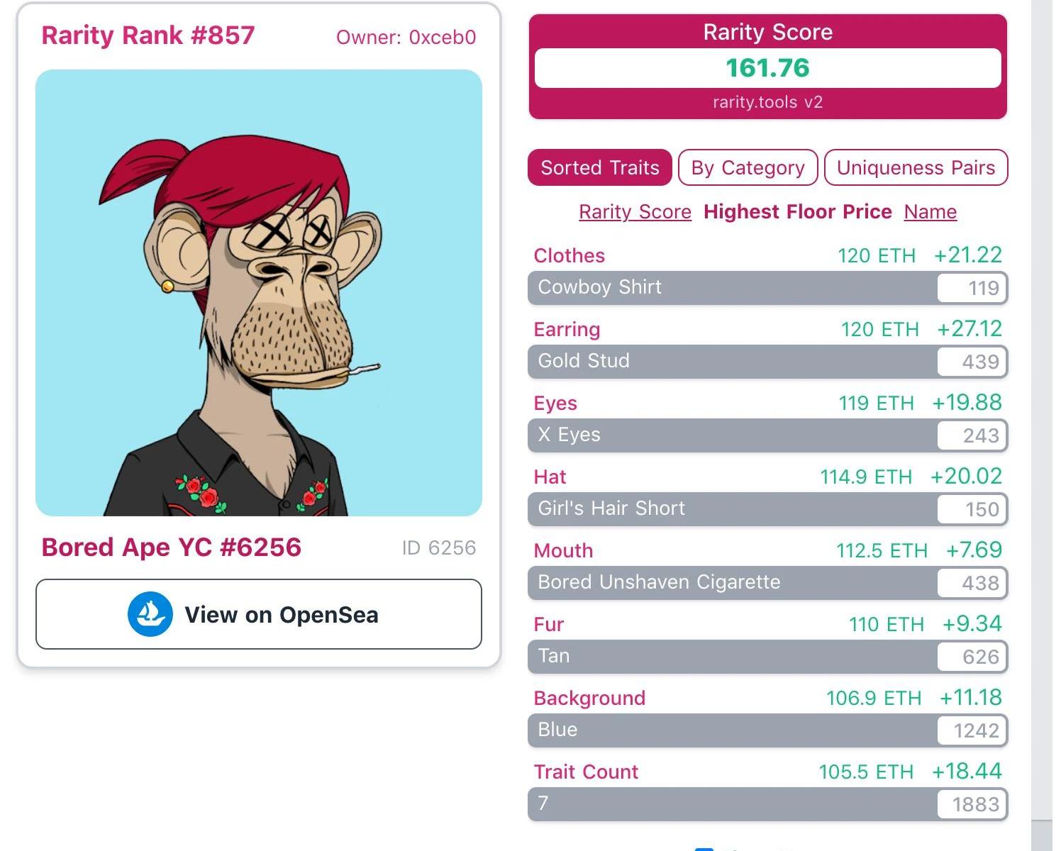 去年8月,在BAYC地板价40个ETH的时候,一个朋友问我,这只猴是“最稀有的里最便宜的”,是不是值得入手,当时这只猴子的挂价是67ETH。=