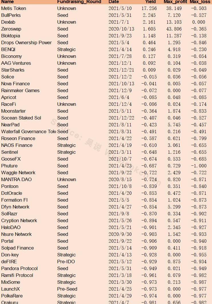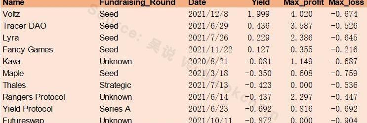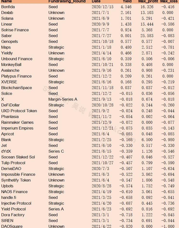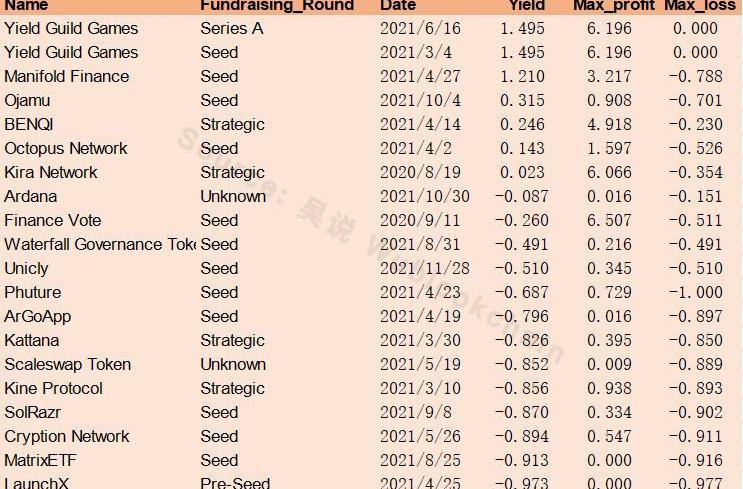 多数投资者喜欢追踪项目的融资信息,以此作为项目资质的评判标准。本文详细统计了自2020年7月以来的590个已发Token项目的融资信息,计算自融资信息公布以来的收益率、最大收益和最大亏损。从两个角度呈现VC对投资者的借鉴意义。第一,从VC角度出发,列举40家知名VC的投资情况,计算其损益。第二,从项目角度出发,筛选业绩表现较好的项目,挖掘其背后的VC。之所以不统计2020年7月以前的数据,是因为当时的融资信息比较凌乱,大部分都没有披露。本报告存在很大的局限性,需要读者注意:非常重要的一点是,项目token的损益不是从发行日开始算起,而是从融资信息公布日开始算。以AxieInfinity为例,该项目发行至今上涨了超过300倍,a16z与Paradigm等一众知名VC都参与了其B轮融资,但如果按发行以来的收益率计算就会高估他们的实际收益率。事实上,B轮融资是去年10月公布的,而Axie的暴涨发生在去年夏天,如果只计算10月以来收益率,那么真实数字为-50%。那么VC的真实收益率就是-50%?也不尽然!我们不知道他们的成本价,更不知道他们的退出价,也无法知道在不同项目的金额分配。因此用这种方式衡量VC的投资能力过于想当然了。本文计算的所有收益率均不代表VC投资业绩,只是衡量融资信息对于投资者的参考价值。部分项目存在多轮融资,上述590个项目共有685条融资数据。所有融资数据均来自DoveMetrics,价格数据均来自CoinGecko,数据截至2022年2月10日。此外需要注意的是,对于顶级VC来说,投资收益曲线拉长,例如它们在2020年7月以前投资的一些项目,也会在这之后获得高额回报,本文没有进行相关统计。知名VC40家VC按照投资信息公布以来的收益率排序: