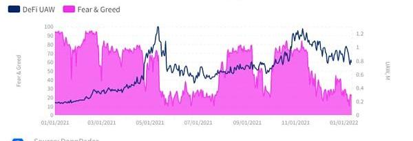 DeFi与宏观指标之间的强相关性尽管落后于区块链游戏和NFT,但DeFi领域的总锁仓价值在2021年底达到了历史新高。在包括流动性挖矿计划在内的吸引力方案的推动下,该领域的竞争力显著回升。然而,没有其他领域比DeFi更容易受到加密市场的影响,因此宏观指标以及DeFi链上指标可能会为我们提供一些关于用户行为趋势模式的线索。虽然各自的原生Token对TVL有很大影响,但用户的使用情况并非如此。将比特币的恐惧与贪婪指数(FGI)等宏观指标与用户的使用情况对比,我们可以发现DeFi严重依赖加密市场。下面的两张图表显示了FGI、整个dapp行业的UAW数量以及仅连接到DeFidapp的UAW数量之间的相关性。与整个dapp行业相比,这两个变量之间没有明显的相关性。如前所述,NFT的行为就会独立于加密市场,并受其效用、成熟度、用例等的影响,区块链游戏也是如此。然而,在DeFi中,用途和价值紧密相连。