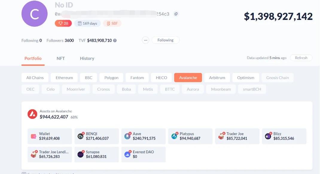 钱包二:总资产9.46亿美金,avax网络资产1亿美金,占比约11%