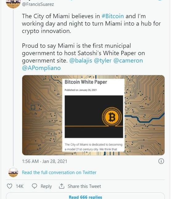 弗朗西斯·苏亚雷斯的经典推文:迈阿密相信Bitcoin,我将努力工作,把迈阿密变成加密创新中心。我很自豪地宣布,迈阿密是第一个在政府网站上托管中本聪白皮书的市政府。4、MicroStrategyCEO力挺BTC