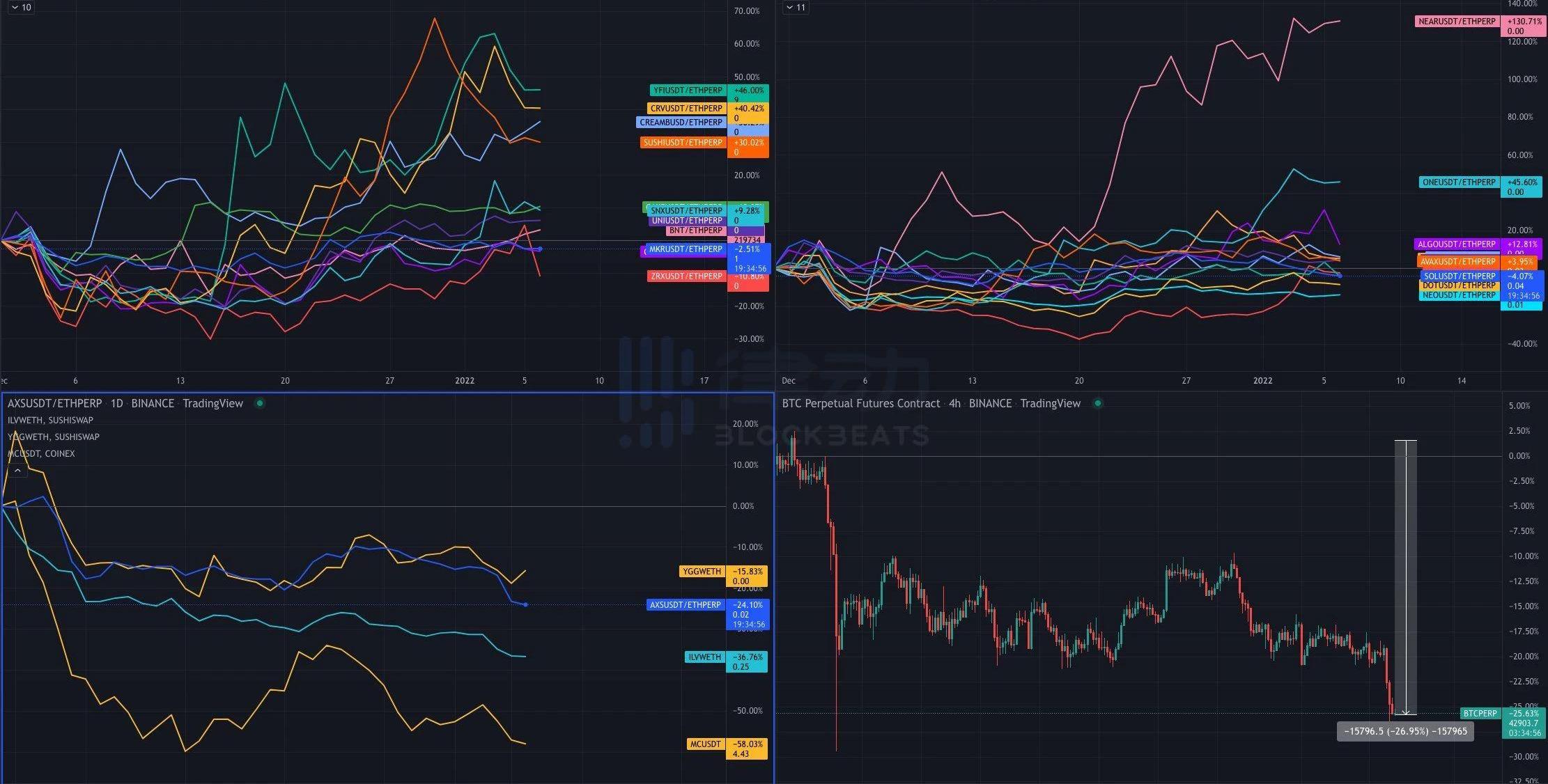 本文梳理自SpartanGroup合伙人JasonChoi在个人社交媒体平台上发布的观点,律动BlockBeats对其整理翻译如下:我更喜欢从风投的视角去思考自己的决策,因为它使我更有成就感,也更有趣。在做长期投资决策时,我通常只考虑数周或者数月的时间范围,而今天的内容主要就是讨论后者。去年11月,我对「下一个熊市会是什么样子」这个问题做了一些思考,简单来说,我认为是极端的板块轮换,以及遭恐慌抛售板块的快速复苏。这种现象从去年12月一直持续到今天:与ETH相比,GameFi和元宇宙下跌了15~60%,而L1则普遍上涨,其中NEAR更是创造了超130%的增幅。同时DeFi也开始出现一些回暖,SUSHI、CRV、YFI与ETH相比都呈现出30~40%增幅。在此期间,比特币却下跌了近25%,这意味着行业整体并没有创造出新的财富,而行业的「抢座椅游戏」则加剧了。长远来看,我确实相信比特币对加密市场的重要性会减弱,但不是现在。
