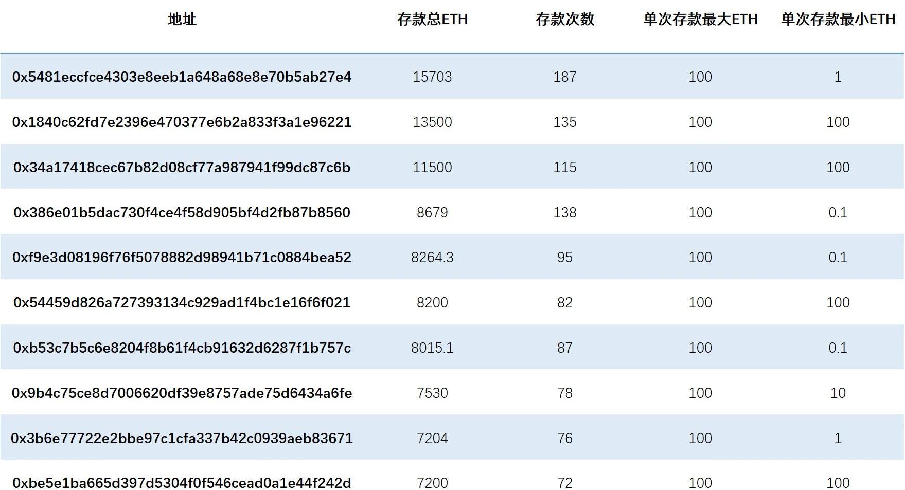 对所有交易进行存款、提款归类后,统计了每个地址存/提款总额、次数、最大存/提款金额、最小存/提款金额统计。得到了22714个存款地址,31737个提款地址,其中存/提款总额Top10数据如下:存钱总额Top10