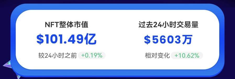 截至12月23日15时,NFT整体市值101.49亿美元,较24小时前增长0.19%;过去24小时内总交易量约5603万美元,日环比增长10.62%。