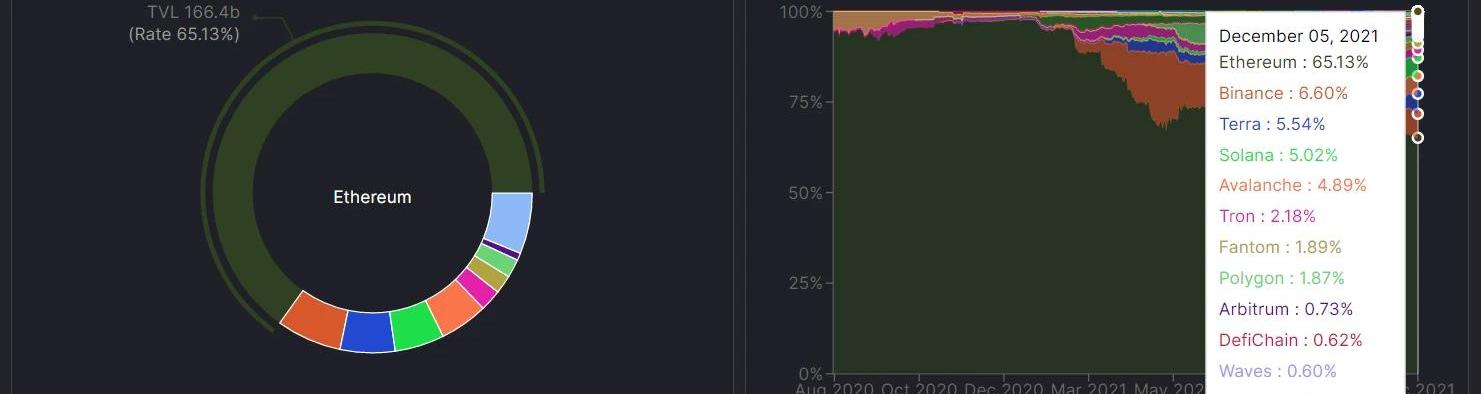 来源:DeFiLlama本周与上周相比,整体锁仓量数据下降0.75B,但相对应受行情影响,整体价格出现较大幅度下跌,TVL下跌较小,币本位上升可能仍在延续。各公链TVL占比情况