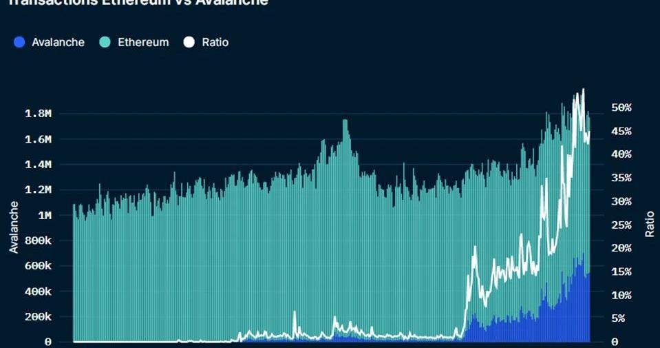 资料来源:Nansen.ai丨截至2021年12月3日从上图中,我们还可以观察到,在8月份,以太坊上每日支付的gas开始显着增加。这主要是由于夏季在Avalanche部署的NFT项目的兴起。以太坊的高gas价格迫使许多项目寻求在其他网络上扩展,在这些网络上部署项目将更便宜、更容易获得。Avalanche能够创建快速、低成本且与Solidity兼容的dApp。因此,各种NFT项目已经利用网络进行部署。例子包括ToppsNFT市场、Kalao、VenlyMarket和Crabada。此外,Avalanche基金会最近筹集的2亿美元资金的一部分将专门用于NFT和文化应用。然而,值得注意的是,Avalanche上最活跃的应用仍然是DeFidApp,例如TraderJoe和Pangolin,分别占所有链上活动的23%和7.5%。Avalanche和以太坊之间的交易比率一直在显着增加,特别是自8月份以来。以太坊vs.雪崩交易