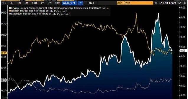 在BGCI指数的资产配置中,80%是比特币和以太坊,因此我们预计在2022年加密货币市场趋势会进一步得到稳固,甚至可能出现激增,跟进我们的图表数据显示,加密美元的市值已经升至1300亿美元以上。美元在加密货币中始终占据主导地位。与大约15,000个竞相争夺投机领导地位的加密货币相比,比特币和以太坊有望继续在加密生态系统中保持领先地位。BNB、SOL和ADA已经取代了一年前XRP、BCH和LINK接近头部的位置。我们的图表描绘了加密美元市值与比特币和以太坊的持续上升轨迹,在我们看来,加密领域变化依然有很多猜测,正如柴犬币和狗狗币所表明的那样,但在前三名位置上,应该不会出现太多变化。下图:加密美元会继续保持牛市。