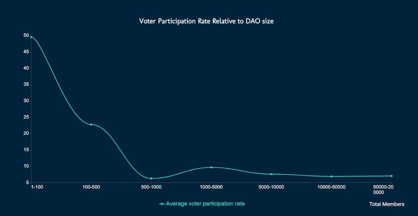 简化传统组织和DAO中的公司关系模型的潜在限制然而,使DAO从根本上优于传统组织的相同特征也可能是漏洞的来源。它所依赖的区块链技术使其无需信任且透明,但也使其代码可供所有人访问,包括潜在的黑客。一个完美的例子是2016年的DAO黑客攻击,在此期间黑客利用了代码中的错误。同样,DAO不能被当局或政府关闭,因为它依赖于作为第三方的区块链,这一事实可能很快会越来越多地引起监管机构的注意。除此之外,它缺乏垂直性使得决策时间很长。尽管如此,我们还是看到了DAO中代理投票的出现,这可以使治理更加高效和有效。更一般地说,DAO的结构将越来越多,包括代表、子团队和专业高管。实际上,DAO模型本身就存在局限性,并不适合所有类型的组织。虽然我们不知道它会在多大程度上破坏所有形式的人类协调,但有一点是肯定的——我们会看到越来越多的DAO出现,而且速度很快。接触这股革命性的浪潮您现在了解了DAO的基本模型,并且已经热衷于了解这一新兴趋势。您可能想知道:我如何参与?快速答案是通过获取其原生代币来加入DAO。根据DAO,您必须在发布日期或之后购买一个或多个,某些DAO甚至会向活跃的贡献者赠送代币。然而,一些DAO会成功,而另一些则不会表现良好。因此,重要的是在参与之前对项目、成员质量进行尽职调查,并分析如何/可以在DAO中驱动价值。尽管该领域仍然相对较新,并且还没有建立评估DAO的指标,但我们在下面提供了一些推动质量成员资格和DAO价值的因素。DAO价值的驱动因素有效的激励机制了解成员如何因其在DAO中的贡献而获得奖励非常重要。通常,治理权、贡献奖励或利润份额会激励成员为DAO工作并积极参与治理。这反过来又使组织更有效率。另一种看待它的方式是,代币的二级市场价值会随着DAO变得更加成功而增加。如果DAO变得越来越成功,它将引起其他市场观察者的注意,他们希望抓住DAO的创意/货币输出、国库投票权等优势。因此,DAO的代币升值。当代币升值时,会激励成员更多地工作,从而继续推动DAO的成功和代币的价值。因此,我们可以预期,从长远来看,对贡献者有一致激励机制的DAO可能会比其他DAO表现得更好。成员根据他们的工作/贡献获得的奖励越多,DAO的价值就会被推向更高的高度。选民参与率高DAO的价值不仅由每个成员的工作驱动,还由积极参与治理驱动,这使组织能够不断适应和成长。拥有投票权并不一定意味着成员会投票。您可以通过考虑所有提交提案的选民参与率来衡量成员参与决策的程度,您可以在深度DAO。DAO的规模越小,该指标的相关性就越大。您可以在下面注意到,最大的DAO通常是参与率较低的那些。这背后的原因是它们主要是大型协议DAO,其中集体决策目前仅限于边缘问题。