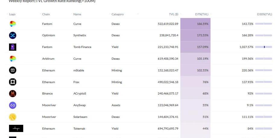 撰文:Footprint分析师Simon(simon@footprint.network)日期:2021年10月24日-10月30日数据来源:WeeklyReport(https://footprint.cool/wr1101)本周排行榜:TVL大于100M且上线超过30天的协议中,本周上涨最快的是Curve,属于Fantom链,7天上升了186.59%,30天上升了143.72%。本周主要链增长最快的协议:以太坊:mStable,当前TVL为1.5亿美元,7天上涨了102.55%币安链:ACrypto,当前TVL为2.4亿美元,7天上涨了67.54%本周前主要类别增长最快的协议:DEXes:Fantom链上的Curve,当前TVL为5.2亿美元,7天上涨了186.59%Lending:Solend,当前TVL为2.1亿美元,7天上涨了39.96%Yield:TombFinance,当前TVL为2.2亿美元,7天上涨了157.09%