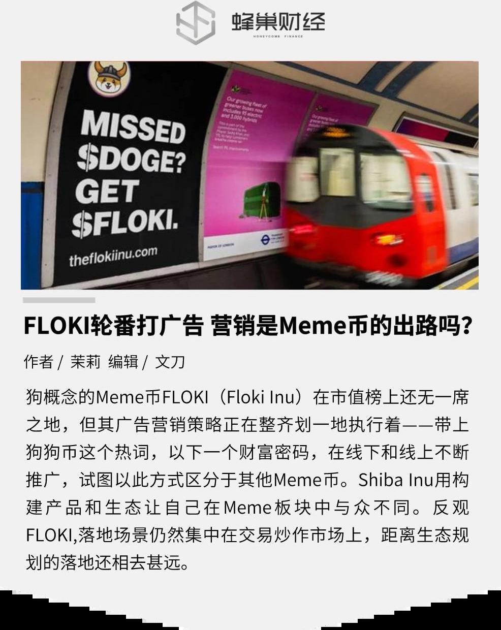 FLOKI交易量反映了一定人气而在数据网站Coingecko收录的Meme币数据统计中,截至11月3日,FLOKI的24小时交易量超6938万美元,可以排进整个板块交易量的前五名,虽然只是SHIB的1.3%,但也可见其在Meme市场有一定的人气。这个以马斯克宠物狗的名字命名的Meme币发行于今年8月,和特斯拉创始人沾边为它带来了第一波人气,至少在8、9月份,它的宣传方向始终围绕着马斯克进行,比如,「FlokiInu是马斯克弟弟金伯·马斯克的合作项目」,「FLOKI计划打造以马斯克家乡为主题的NFT游戏」等等。到了10月,FLOKI的营销方向变成了Meme概念币的鼻祖狗狗币DOGE,这一次,其营销关键词是「财富密码」。10月6日,有营销团队在推特上放了一张照片,一张写有「错过了狗币?买FLOKI」的广告海报被挂在了伦敦地铁站的立柱上,配文「这表明我们计划将FLOKI品牌打造成伦敦和英国最熟悉的品牌之一,FLOKI广告也将很快在伦敦的300辆公交车上上线!」FLOKI广告出现在伦敦的地铁站里英国《金融时报》联系到了FLOKI背后的营销团队,对方表示,这个广告旨在使FlokiInu在普通大众眼中合法化。化名为Sabre的营销团队人员称,他们希望激大众对FLOKI品牌的信心,有必要将FlokiInu与加密世界中存在的许多局项目区分开来,「这些广告活动将对伦敦公共交通系统的全面铺开,」该人员透露,类似的广告活动还会在洛杉矶和日本、中国和俄罗斯推出。《金融时报》询问了关于FlokiInu背后团队的问题,但对方「没有回应哪些个人或公司实体控制该项目的评论请求」。FlokiInu仍然是一个匿名团队,但在推特上小有名气的KOL正在为它站台。11月1日,推主SlumDOGEMillionaire告诉他的11万粉丝,对于那些错过狗狗币DOGE的人来说,FLOKI是赚钱的重大机会,「是一个出路。」在这名KOL的推特评论中,狗狗币的联合创始人比利·马库斯出现了,「没有所谓的出路,」他回复道,「只是早期的人变得更富有,后来的人变得更穷,除非后来的人中有新的更穷者出现,前人才能变得更富有,」他直白地抨击道,「『它会让你富有』这样的广告是虚伪的。」言外之意,比利·马库斯暗示FLOKI这类币只是一场后者接盘前者的「庞氏」游戏。在他看来,加密财富创造没有灵丹妙药,只是有人选择了一个被市场忽视的Token,然后该Token的突然暴涨营造了一种幸运的错觉。他的观点正符合狗狗币因马斯克喊单后暴涨的案例。脱离Meme币印象FLOKI仍在挣扎