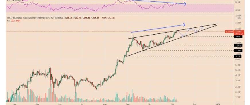 尽管最近一次反弹创下历史新高,但由于至少有两个看跌指标,SOL可能会经历一次回调。首先,SOL价格一直在形成上升楔形,这是一种通常会导致价格下跌的技术形态。其次,该加密货币也证实了其价格上涨和动能下降之间的存在看跌背离。