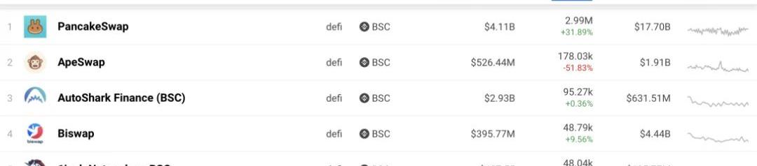 BSC上排名前5的DeFidapp,再次强化了交易者已改变其忠诚度的观点。通过1inch,可以再次看到一个移植到BSC的以太坊金融dapp代币交易聚合器,目前在BSC列表中排名第五,同时也显示出最高的月度增长。ApeSwap的情况有些复杂,它可能凭借上个月新的IDO和IAO产品刺激了用户活动而导致本月有所回落。此外,它也Polygon上运行。