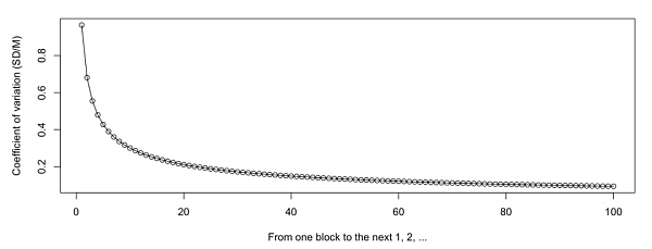 因此,如果我们把以太坊作为一个时钟,我们会在更大的时间单位上实现更多的稳定性。这可以通过将变化除以时间长度来进一步显示,称为变异系数。这个系数衡量的是你的价差相对于平均值有多高的变化。因此,如果我们用以太坊作为一个时钟或计时器,相对于我们希望估计的时间,我们会有多大的偏差?