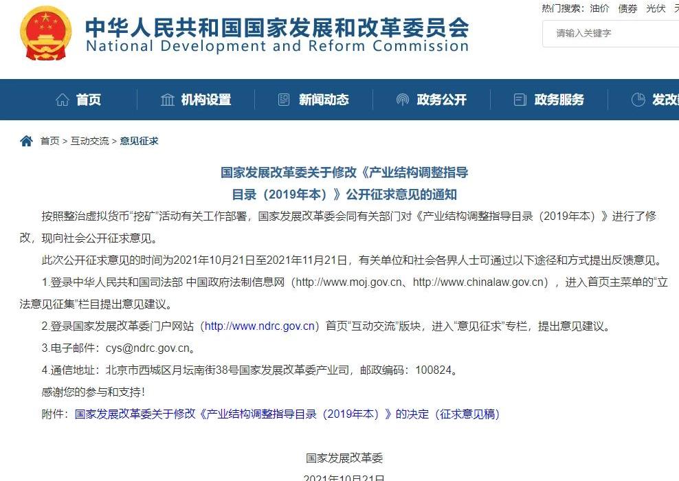 10月21日消息,国家发展改革委就修改《产业结构调整指导目录》公开征求意见。为尽快推动整治虚拟货币“挖矿”活动有关工作部署落地落实,建议将虚拟货币“挖矿”活动条目以增补形式列入现行《目录》,以《国家发展改革委关于修改<产业结构调整指导目录>的决定》形式发布。