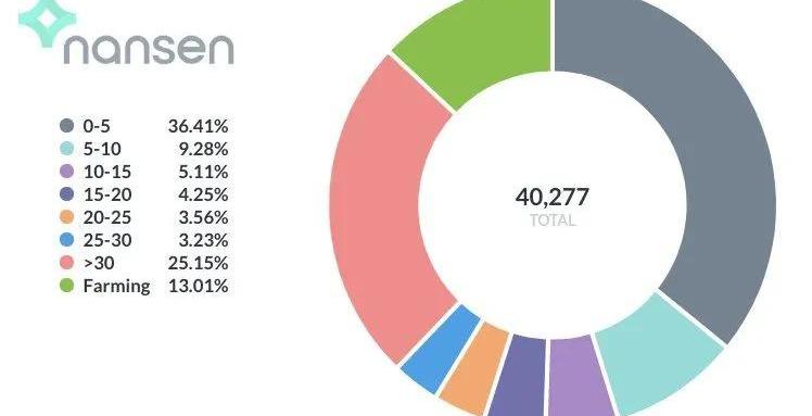 这种向稳定资产的转移意味着风险池的流动性已基本枯竭。而风险池已经受到用户忠诚度低的影响。南森研究最近报道了SUSHI支持的流动性挖矿的行为(MasterChef)。不出所料,大多数农场的流动性都非常不稳定。在MasterChef农场,一半的农民在农场呆的时间从不超过15天。下图显示了流动性供应者在单个农场的天数分布情况。