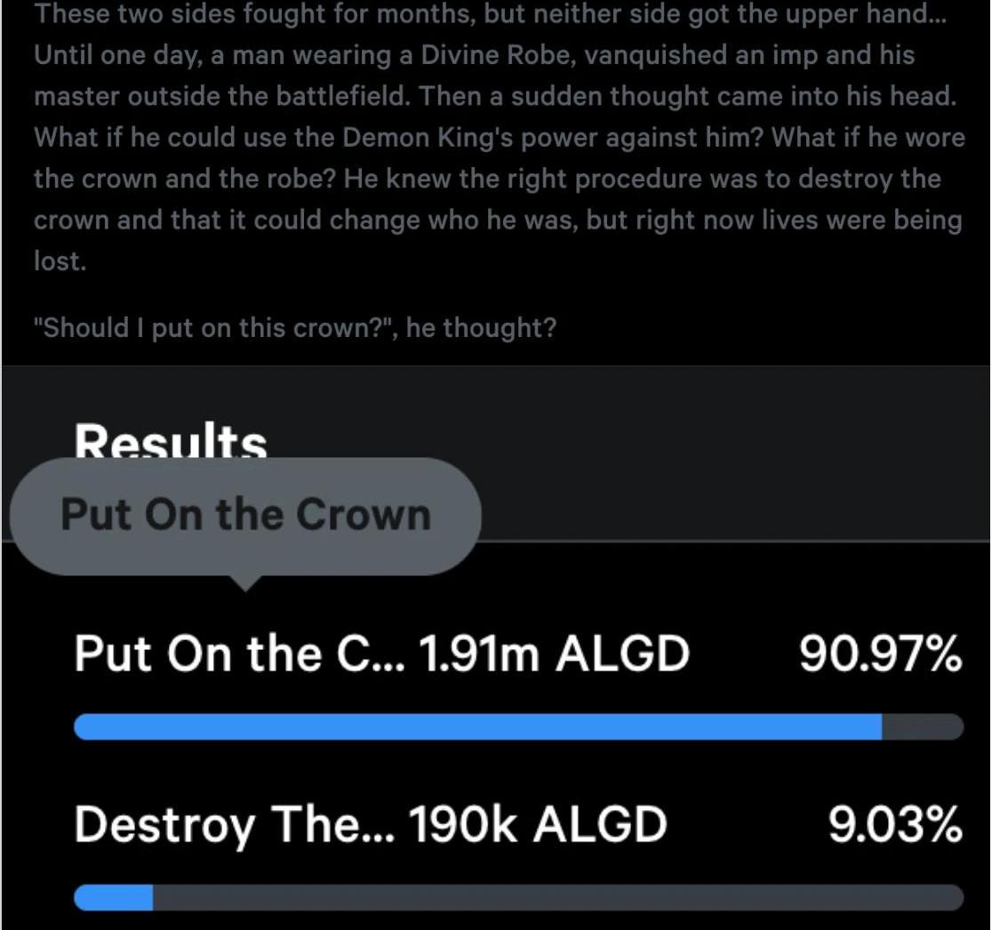 $AGLD背后的想法是,它可以作为一种游戏货币,融入到某天构建的游戏中。但就像Loot本身一样,它的价值有待解释。这并没有阻止人们将其纳入其他萌芽的Loot项目,包括以Loot为主题的“选择你自己的冒险”故事,$AGLD持有者可以在其中投票决定故事的方向。在“HolyWarLore”的第1章中,$AGLD持有者被允许投票决定一个穿着神袍的人是否应该戴上魔王的王冠来吸收他的力量。在第2章中,王权让这个人陷入困境,目前正在投票决定他应该如何处理这种情况。