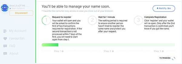 首先,我们需要在钱包中确认一笔交易,这是完成域名注册所需的两笔交易中的第一笔, 如果第 1 步完成之后的 24 小时内没有进行第 2 步,则需要从第 1 步重新开始。