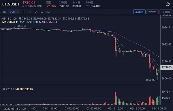 受新冠疫情带来的恐慌影响,比特币从2月13日开始下跌走势。3月12日开始上演跳水行情。3月12日18:10,比特币从7300美元开始下跌,半个小时内跳水至5555.55美元,暴跌近24%。3月13凌晨4点再度从6000美元跳水至4350美元,再度暴跌近27%。3月13日9:45再度跳水至3800美元。24小时跌幅超50%。(注:截止发稿,比特币价格已从3800美元反弹至4730美元。)
