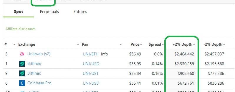 正如我们之前提到的,价格冲击在交易总执行成本中占很大一部分。以下是一些能够将价格冲击最小化的简单策略:找到深度最好的市场:到目前为止,我们已经确定价格冲击取决于交易规模在流动性池或市场规模中的占比。因此,我们希望找到在某个价格区间流动性最好的交易池,以使成交价尽可能接近市场价格。Coingecko上的市场深度表是一个不错的切入点。