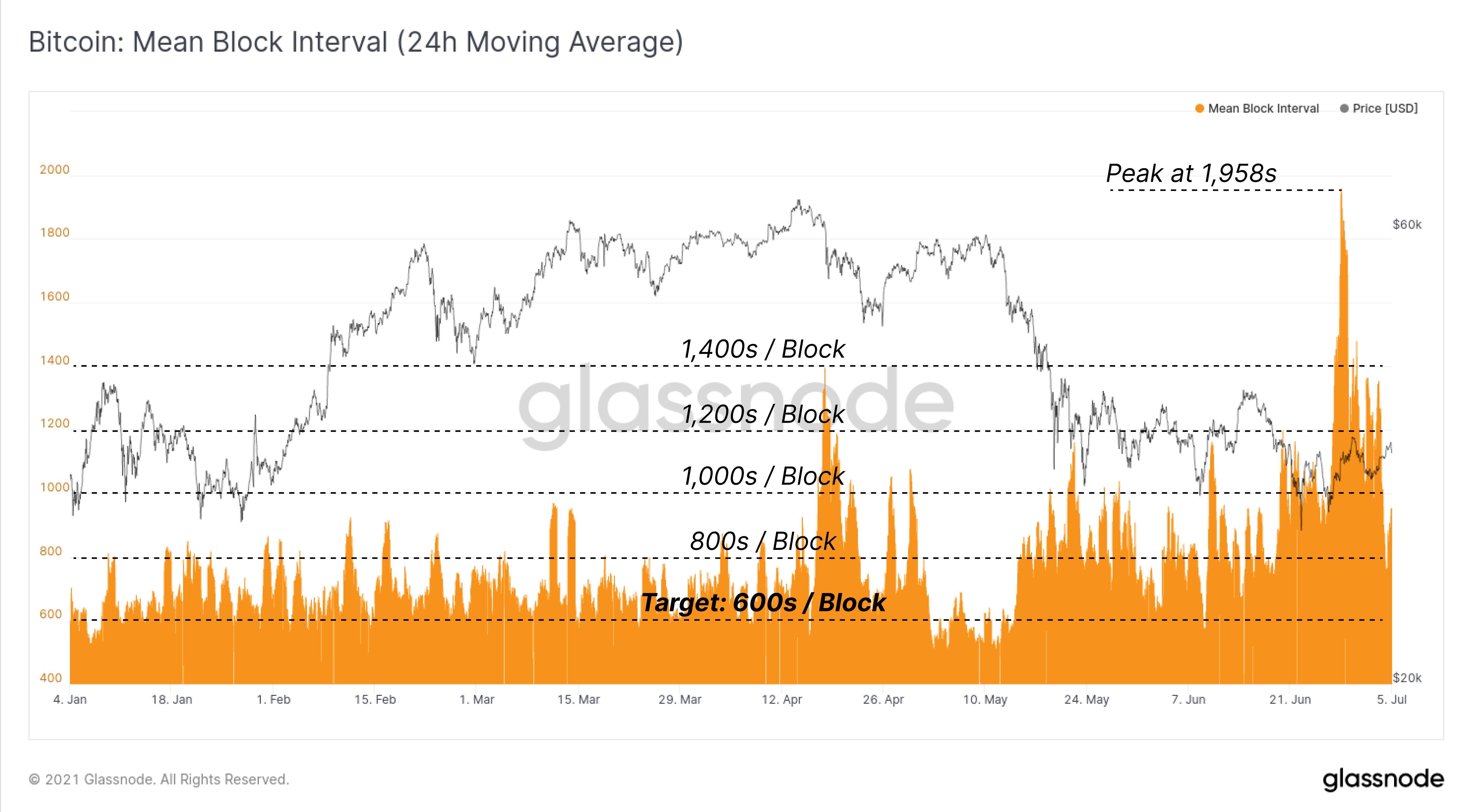 上周,随着中国比特币挖矿禁令影响的全面展开,我们发现挖矿指标出现了大量波动。当很大比例的算力离线时,区块将以较慢的速度创建,直到难度向下调整。这将挖矿难题的复杂性重新调整为在2016难度窗口内观察到的平均算力。上周,24小时平均区块间隔飙升至1,958秒的短期高点,这要比600秒的目标区块时间长226%以上。此事件仅在6月28日短暂发生,之后平均区块时间又恢复到800-900秒。