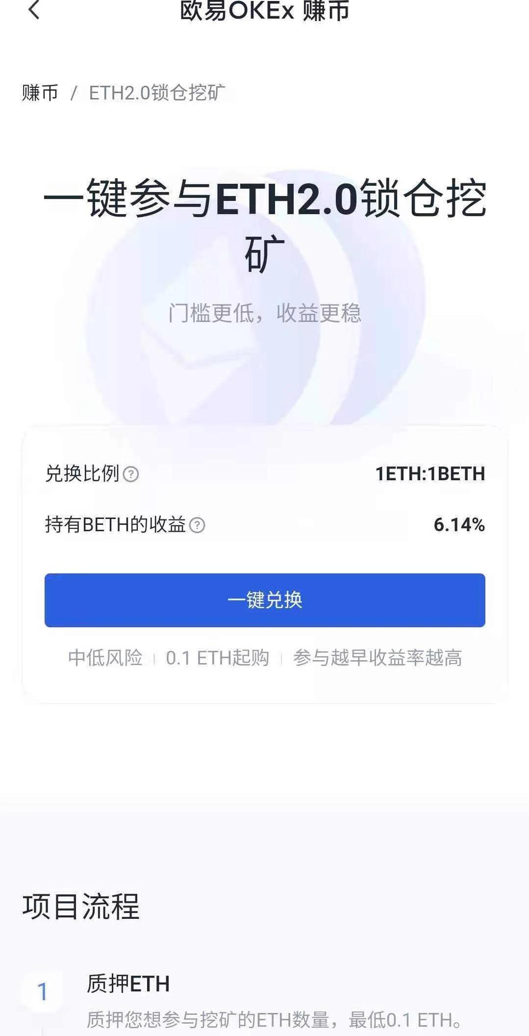 来源:beaconcha.in来看两个头部质押池的例子,Ankr和RocketPool。通过Ankr进行质押,用户体验非常好,但这一平台仍然有最小质押数额的限制,用户需要至少持有0.5个ETH,相当于1589美元左右。通过Ankr质押的APY为9.64%,但是,Ankr会对所有质押奖励收取15%的费用,它利用这笔钱来搭建基础设施、发行合成资产aETH。这样算下来,如果用户通过Ankr质押1个ETH,每天的收益为0.331美元。而RocketPool的最小质押数额的限制要低于Ankr,只要0.01ETH,大约31美元。和Ankr一样,RocketPool为用户提供了可交易的合成资产rETH。RocketPool的APY是9.8%,收取10%的服务费用,但如果你持有超过16个ETH,则不收取佣金。这样算下来,如果用户通过RocketPool质押1个ETH,每天的收益为0.42美元。2、通过交易所参与其实相比质押池,参与ETH2.0质押还有更简单的方式:通过交易所参与。投资者只需要注册或使用现有的账户,提币或购买ETH,并进行质押即可。交易所的界面清晰美观、操作方便,是不错的选择,但为了避免风险,最好选择大型交易所,例如欧易OKEx就是一个相对安全的质押平台。欧易OKEx于2020年12月14日上线了以太坊2.0质押挖矿服务,用户可一键质押ETH,最低参与限额为0.1ETH。质押成功后,用户将以1:1的比例获得挖矿凭证BETH,并每日领取挖矿收益。挖矿收益将根据链上质押数量及锁仓时间,以BETH形式发放。在以太坊2.0主网上线后,用户可根据持有的BETH数量,1:1兑换回ETH。基于以太坊2.0的链上规则,质押资金将被锁定1-2年,且无法提前赎回,但BETH可以灵活退仓。ETH2.0挖矿收益根据链上锁仓量动态调整,预计年化收益率在4%-20%之间。目前,持有BETH的收益为6.14%。总的来说,在欧易OKEx上参与ETH质押,参与门槛低,可以获得稳定的收益,灵活性高,只用花费很低的成本,就能成为以太坊主网性能升级的见证者。下图是在欧易OKExAPP上参与ETH2.0锁仓挖矿的具体流程: