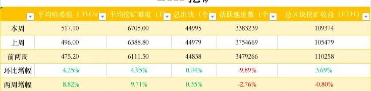 etherchain.org数据显示,平均算力环比上涨4.25%,暂报517TH/s;平均挖矿难度环比上涨5%,暂报6705T;链上活跃度环比下降10%;以太坊Gas费略微上涨,挖矿总收入环比上涨3.7%。四、消息面