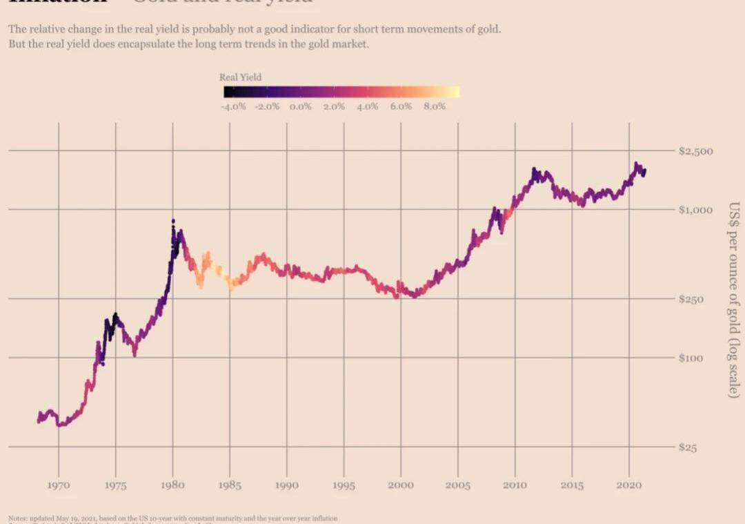 自1960年代以来的实际美国债券收益率现在让我们这样做:让我们画出1970年至今的黄金价格(对数标度);每一个代表黄金价格的点都是根据当天的实际收益着色的;颜色越浅,实际利润越高。颜色越深,实际盈利能力越低。这是我们得到的结果: