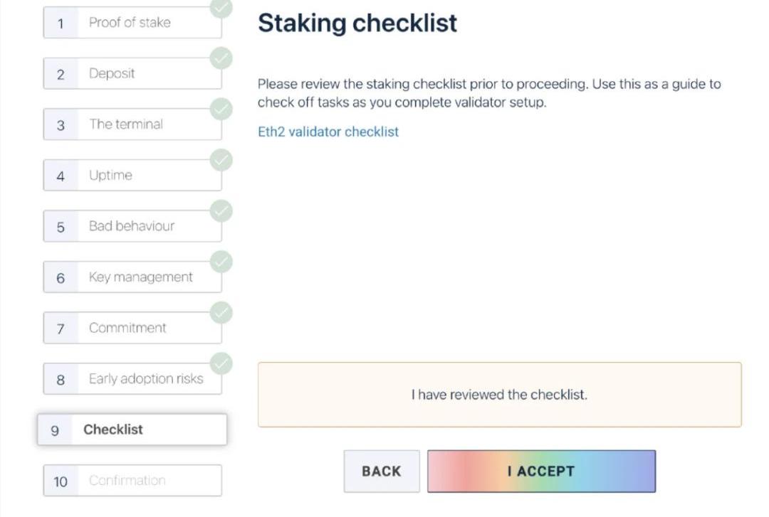 要质押,就需要运行ETH2客户端,它是区块链的本地副本。这可能需要一段时间才能下载到用户的计算机上。遵循下面给出的链接,模拟所提供的步骤,并在作为验证者进行质押决策之前仔细参考条款和条件。https://launchpad.ETHereum.org/en/1.咨询及测控:第一步是阅读给定的建议并同意在安装验证器客户端软件之前仔细理解它们并质押ETH。