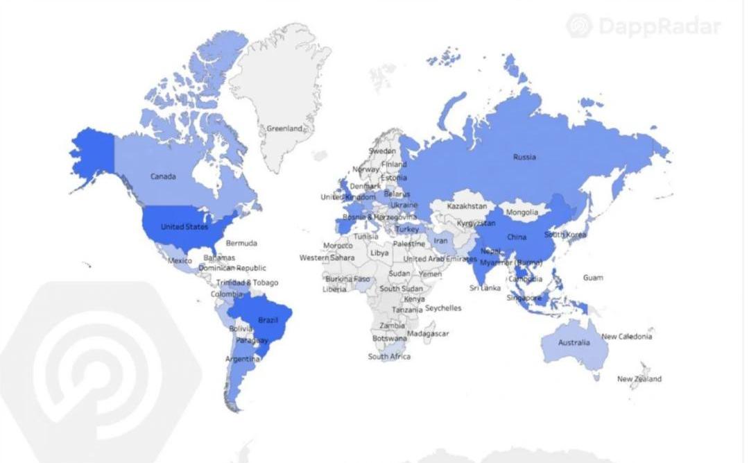 来源:DappRadar最后,这个行业最热门的领域是游戏。“从游戏中赚取”的模式对整个行业产生了巨大的影响。区块链游戏产生的微观经济正在被新兴经济体所接受。我们的流量洞察支持了这一论点。其他在这一类别中可见的国家包括美国、巴西、泰国、越南和委内瑞拉。