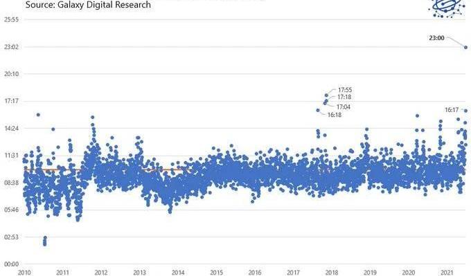 撰文:AlexThorn,GalaxyDigital企业范围研究负责人翻译:卢江飞前天,即2021年6月27日,是过去十年中比特币区块出块速度最慢的一天,平均区块时间达到了23分钟,而此前平均区块时间基本上维持在10分钟左右。最近,中国四川等省份叫停了比特币挖矿,可以说,这是比特币网络有史以来面临到的最具破坏性的一次行动。但比特币网络没有被打垮,而是在逐渐适应市场变化,未来也会越来越繁荣。
